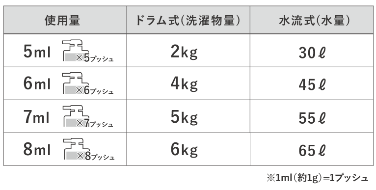 ※ドラム式も水流式も、洗濯物の量に合わせて洗剤を計量してください。