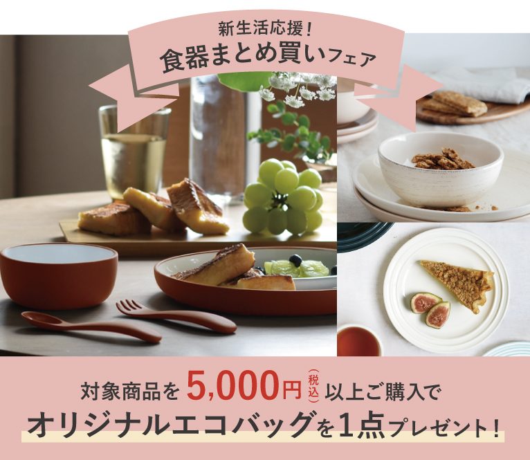 期間中、ダイニングの下記対象商品を税込5,000円以上ご購入で、アミングオリジナルエコバッグを1点プレゼント!!1人暮らしでも家族でも、新生活には欠かせない食器。この機会にお気に入りのものを探してみませんか?