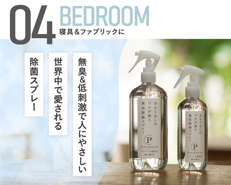 徹底した衛生管理が求められるホテルや介護施設などで採用されている除菌剤を、一般の家庭用に商品化したのがこの「おもてなしのプロが使う無臭除菌スプレー」。強い除菌・消臭効果がありながら無臭で低刺激なのが特徴です。