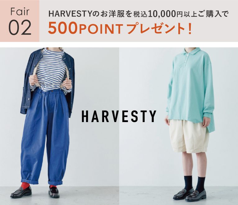 日常を豊かにする服「HARVESTY(ハーベスティ)」のお洋服を税込10,000円以上ご購入で、500ポイントプレゼント!