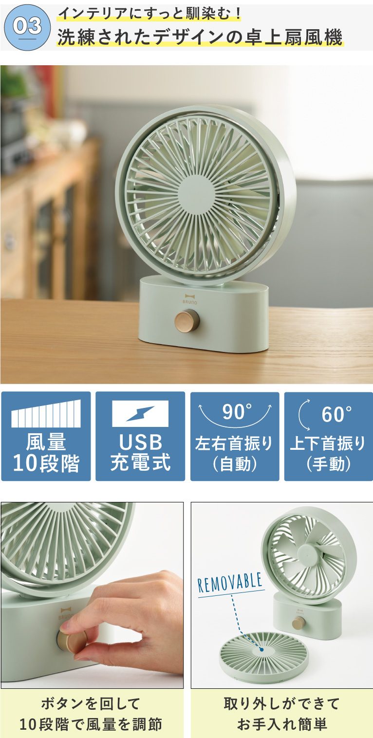 大人っぽい爽やかなワンカラーでインテリアにすっと馴染む、洗練されたデザインの卓上扇風機。コンパクトながら上下左右の広範囲に風を届けることができ、場所を選ばず設置できるので使い勝手も抜群です!USB充電タイプでコードレスなので持ち運びも楽々。おうちだけでなく、アウトドアでも活躍してくれます♪