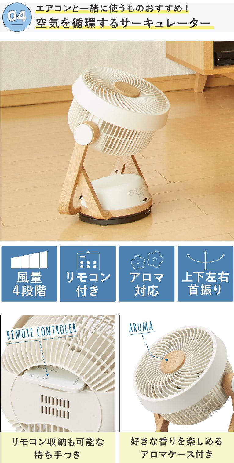 やさしい雰囲気の木目調がおしゃれなサーキュレーター。上下左右の首振り機能が、リビングや寝室など部屋の空気循環をサポートしてくれます。リモコン付きで離れた場所からでもサッと操作することができ、ON/OFFタイマー機能付きなので消し忘れが心配な方にも◎アロマケースもついていてリラックスタイムにもおすすめです♪