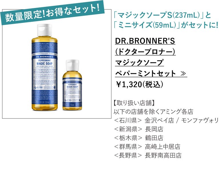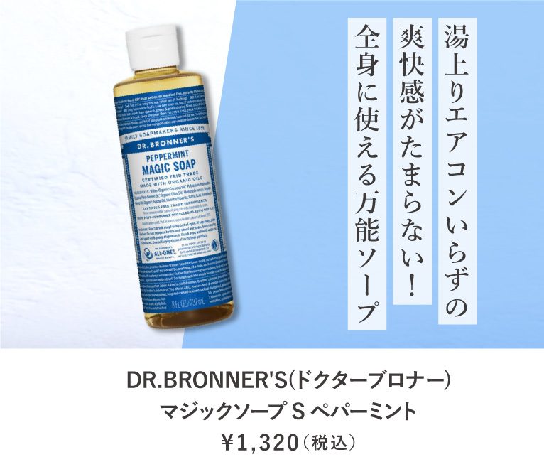 天然由来成分100%で全身に使える「マジックソープ」。ボディソープとして使うと、ペパーミントの爽快感でひんやりスッキリ!その気持ち良さは、「お風呂上がりも扇風機で十分涼しく過ごせる!」という声もあるほど。