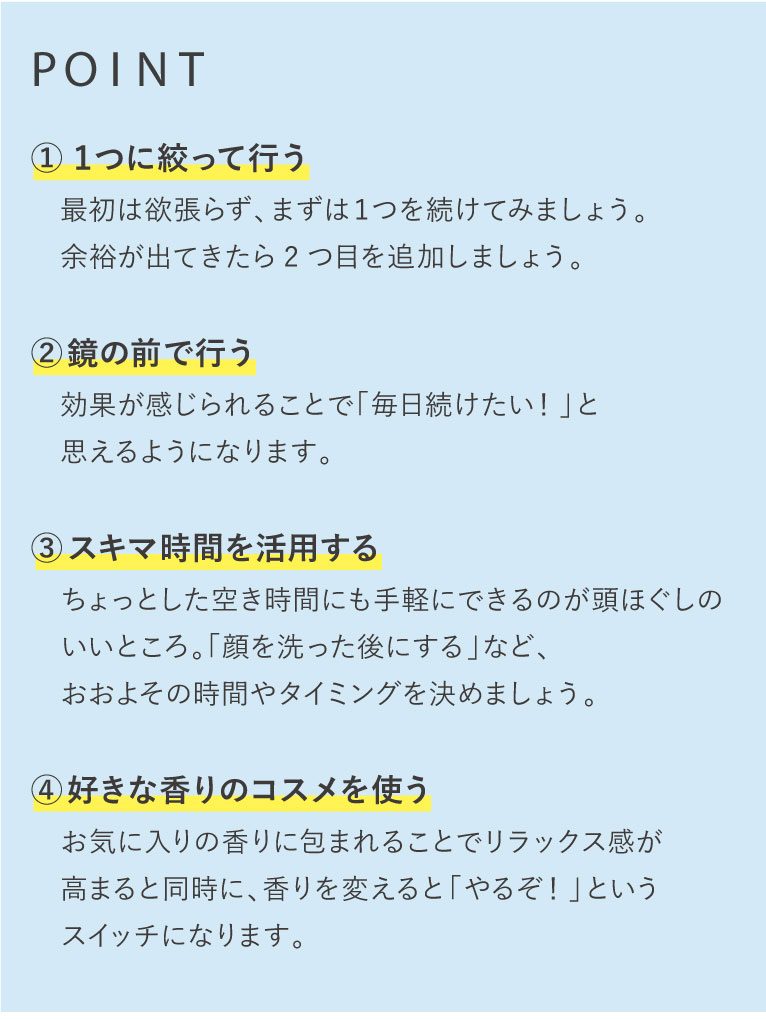 すぐに効果を実感できるのも「頭ほぐし」の嬉しいポイント。そのため比較的続けやすいのですが、いくつも実践しようとすると習慣化するにはコツが必要になってきます。