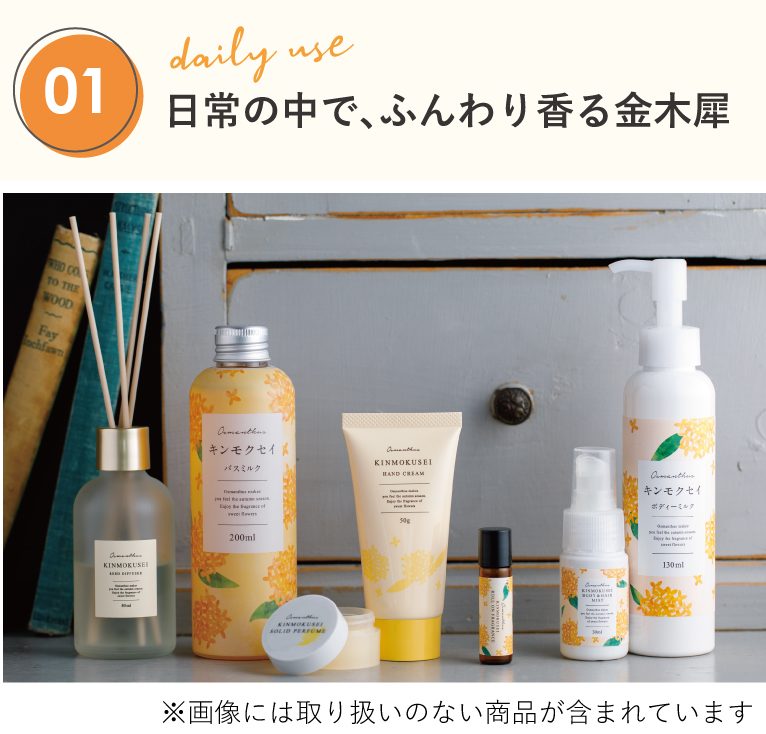 ■商品情報生活の木・ボディー&ヘアミストキンモクセイ 30mL ¥1,430(税込)・シアバターハンドクリームキンモクセイ50g ¥1,760(税込)・ロールオンフレグランスキンモクセイ5mL ¥1,760(税込)・キンモクセイリードディフューザー 80mL ¥2,420(税込)・キンモクセイボディーミルク 130mL ¥2,530(税込)・WSブレンド 精油 キンモクセイ 10mL ¥1,870(税込)・WSブレンド 精油 キンモクセイ 30mL ¥3,960(税込)