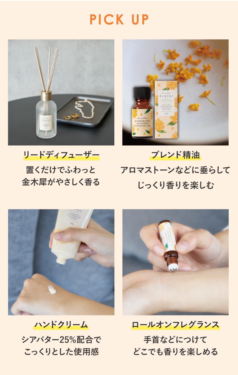 人気ブランド「生活の木」の金木犀シリーズ。ベッドサイドに置けばふんわり甘い香りの中で眠りにつけるディフューザーや、外出先でも手軽に金木犀の香りをまとえる練り香水など、毎日の暮らしをちょっと特別にしてくれるアイテムがラインナップ。