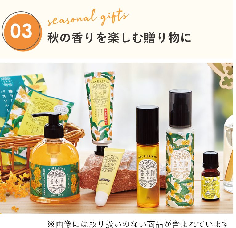 モクセイ花エキス配合で、手肌をしっかり保湿してくれるハンドソープ&ハンドクリームのセットなど、金木犀の香りを楽しみながら使えるボディケアアイテムを取り揃えました。可憐なパッケージで贈り物にぴったりのシリーズです。