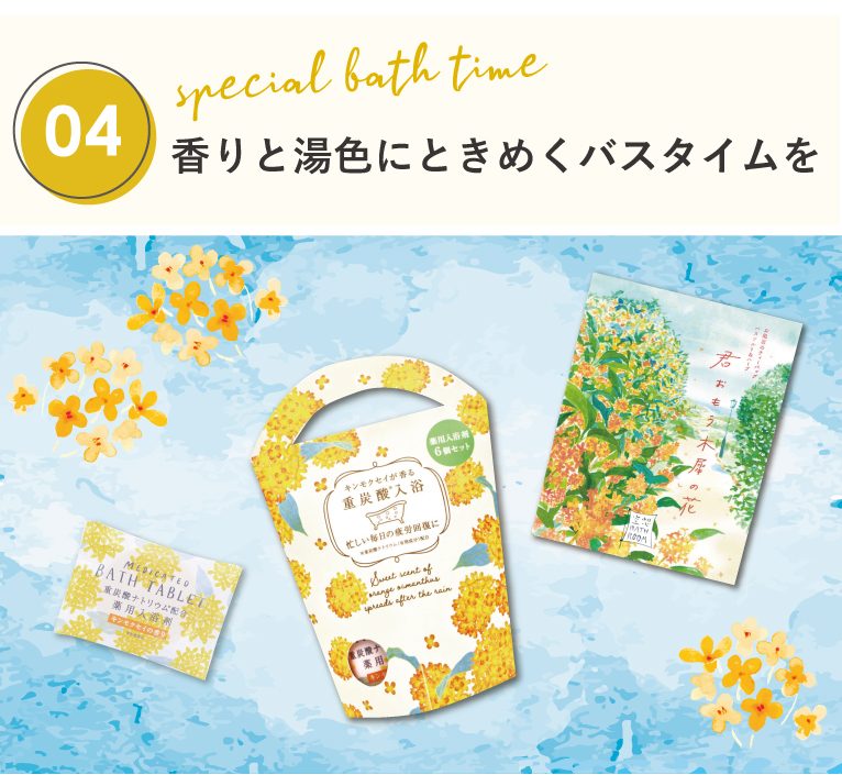 忙しい毎日の中で、ほっと一息自分をいたわるバスタイム。そんな特別な時間に、ほんのり甘い金木犀の香りと明るく鮮やかなオレンジの湯色を楽しめる入浴剤はいかがでしょうか?やさしい色合いのパッケージは贈り物に添えても◎