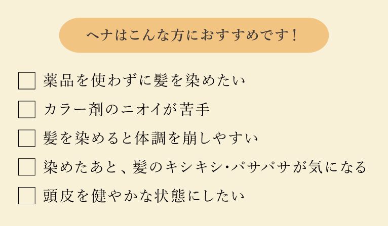 ヘナは髪のたんぱく質を補修する効果によりダメージをケアし、髪内部の保水力を高める作用があります。そのためヘアパックをしたあとは髪の手ざわりもサラサラ!