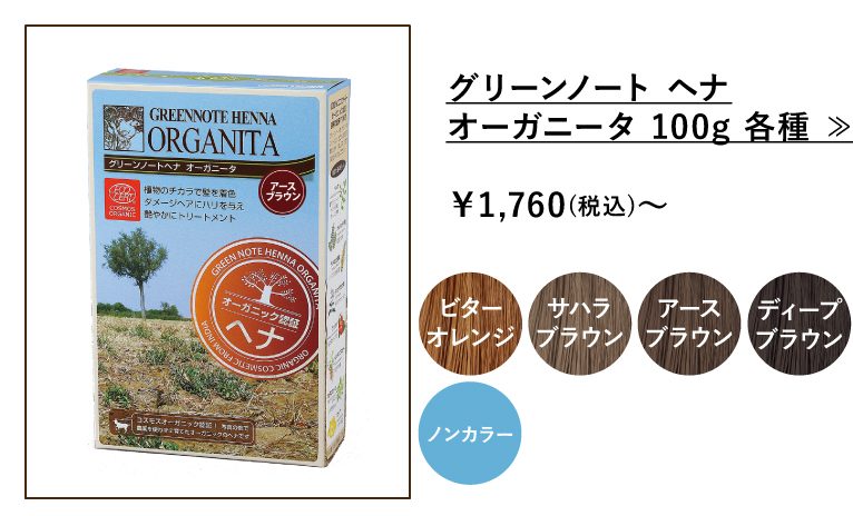 中でも、白髪が3割以上の方はグリーンノートヘナ『オーガニータ』の「サハラブラウン」や「アースブラウン」、5割以上の方は「ディープブラウン」がおすすめです。