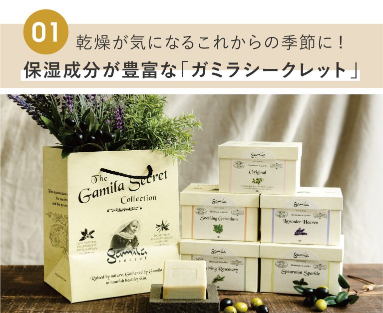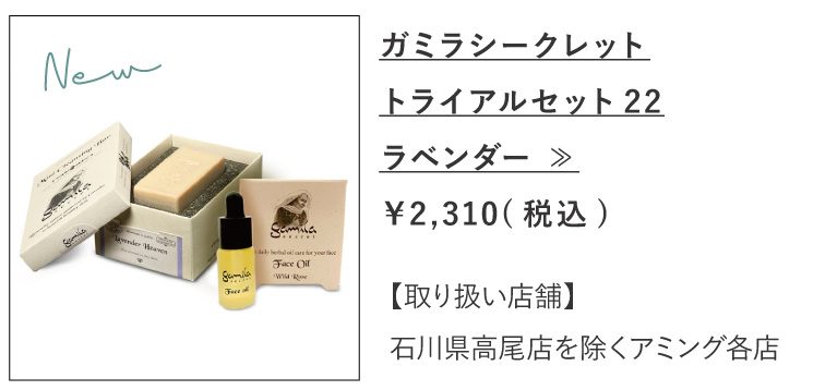 ソープとオイルで完結するガミラシークレットのシンプルスキンケアを体感できます。洗練された素敵なパッケージで、ギフトとしても最適です。