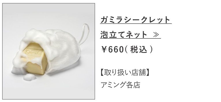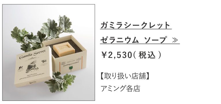 20種類のハーブと良質なエクストラバージンオリーブオイルをたっぷり使用した石鹸「ガミラシークレット」。アミングでもロングセラーの商品です。石鹸というより、肌の水分と油分のバランスを整えるスキンケアアイテムに近いです。