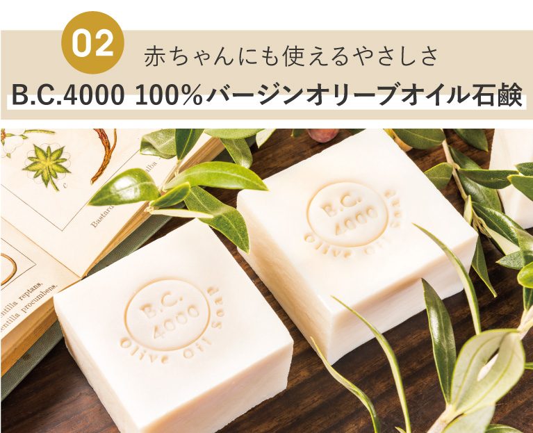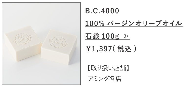 こちらもエクストラバージンオリーブオイルで作られた洗顔石鹸。良質なオリーブオイルを石鹸化した、とてもシンプルな処方で作られています。