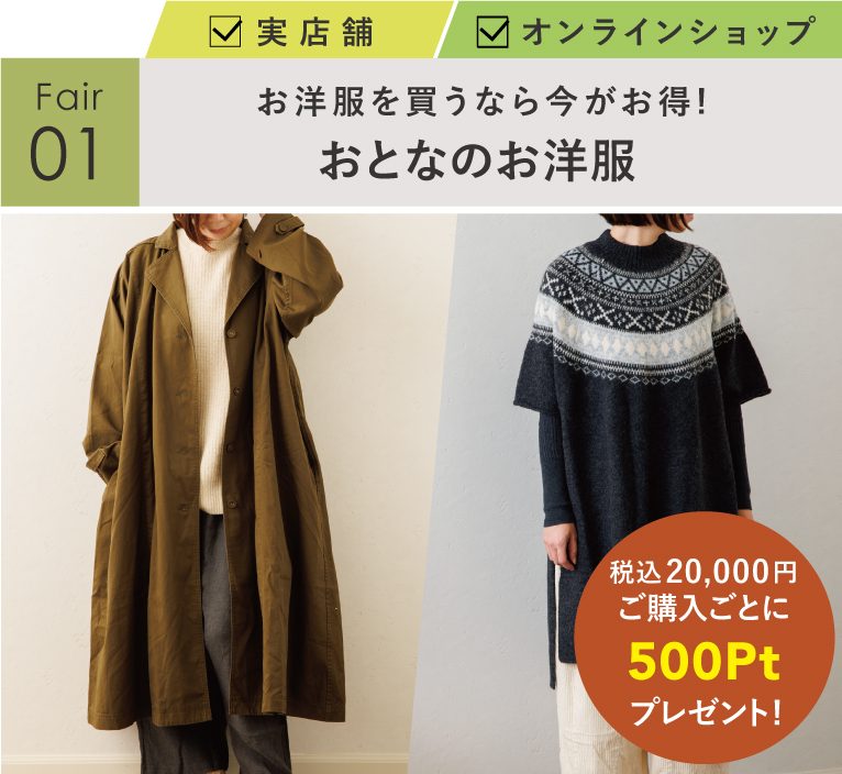 12月は、おとなのお洋服を税込20,000円ご購入ごとに「500ポイント」プレゼント!