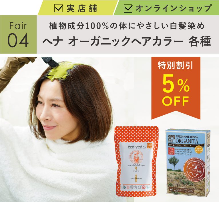 【フェア対象商品】・グリーンノートヘナオーガニ―タ ビターオレンジ ¥1,980(税込)・グリーンノートヘナオーガニ―タ ディープブラウン ¥2,530(税込)・グリーンノートヘナオーガニ―タ サハラブラウン ¥2,530(税込)・グリーンノートヘナオーガニ―タ アースブラウン ¥2,530(税込)・エコヴェーダ2019 ヘナ オレンジ ¥1,980(税込)・エコヴェーダ2019 ヘナ ダークブラウン ¥2,640(税込)