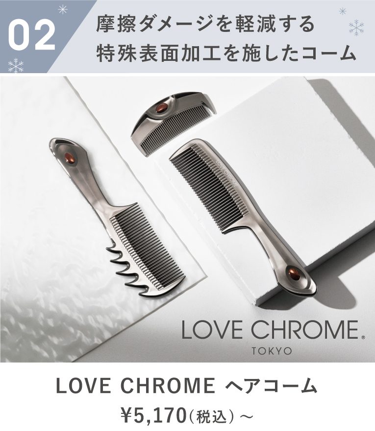 日本の職人の技術で表面を滑らかに加工することで、摩擦ダメージによるパサつきや広がり、静電気を軽減してくれるヘアコーム「LOVE CHROME(ラブクロム)」。髪が濡れた状態でも使えるので、バスタイムのヘアケアにも大活躍です。