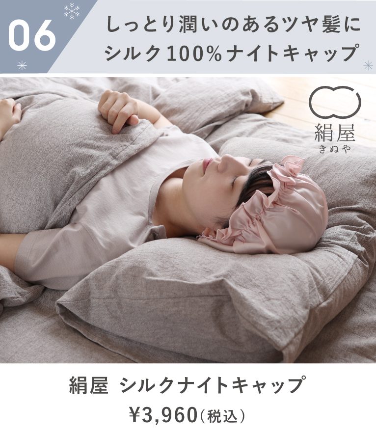 寝ているときの、髪と枕との摩擦を軽減してくれるナイトキャップ。髪にやさしく馴染むシルクは保湿性にも優れ、着けて寝るだけで髪に潤いを与えてくれます。起きたときにはまとまりのあるうるツヤ髪に。こだわりのヘアケアアイテムとして贈り物におすすめです。