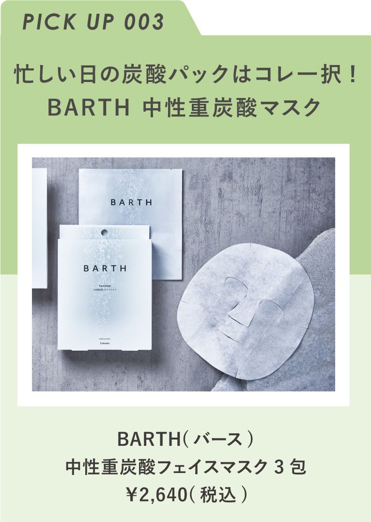 ゆっくりとお手入れをする時間は取れないけど炭酸パックをしたい!という日には「BARTH中性重炭酸フェイスマスク」がおすすめ。
