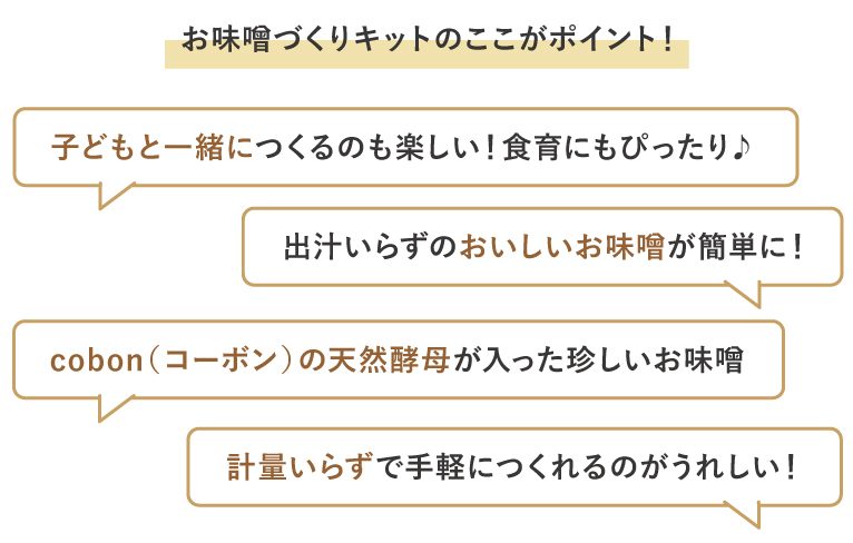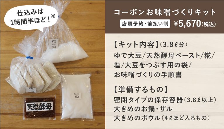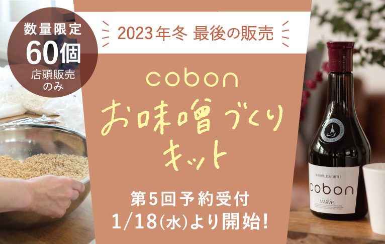 毎年大好評のお味噌づくりキットは、アミングで人気の天然酵母飲料「cobon」の“天然酵母ペースト”を使用しています。