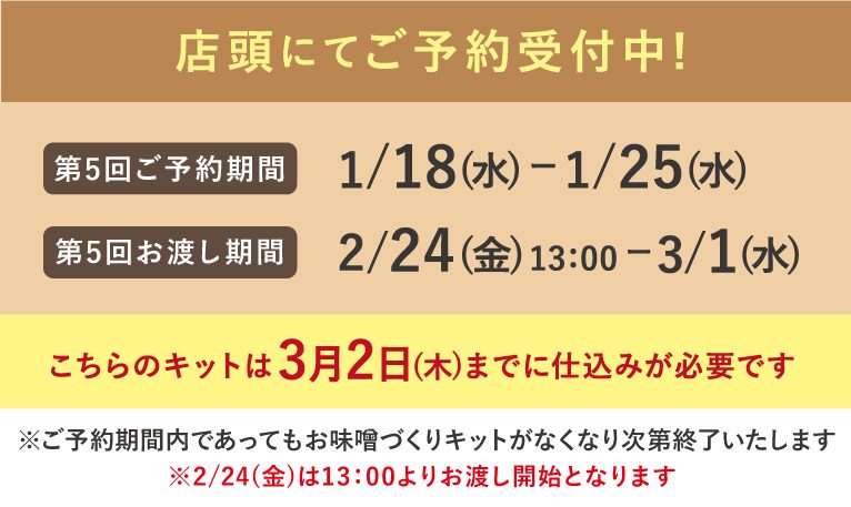【ご予約期間】2023年1月18日(水) ~1月25日(水)※ご予約期間内であってもお味噌づくりキットがなくなり次第終了※1月24日(火)は定休日