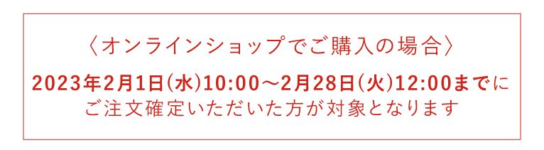【オンラインショップ 開催期間】2023年2月1日(水)10:00~2月28日(火)12:00までにご注文確定いただいた方が対象
