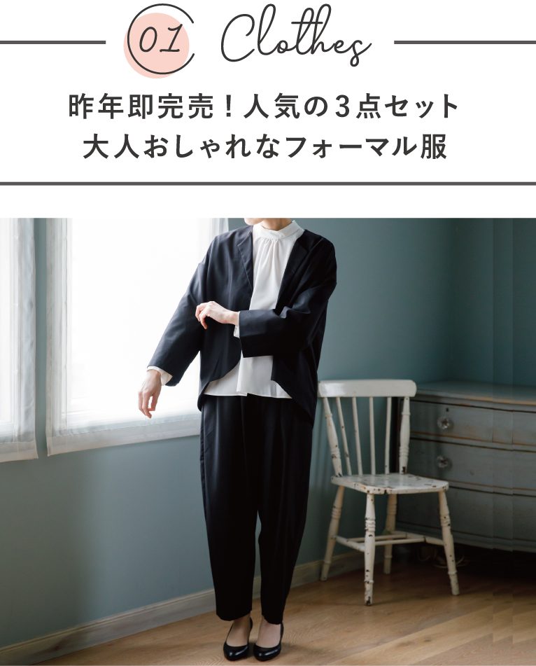 もうすぐやってくる卒入学シーズンにはもちろん、冠婚葬祭にも幅広く活躍するシンプルなジャケット・パンツ・ブラウスの3点セット。
