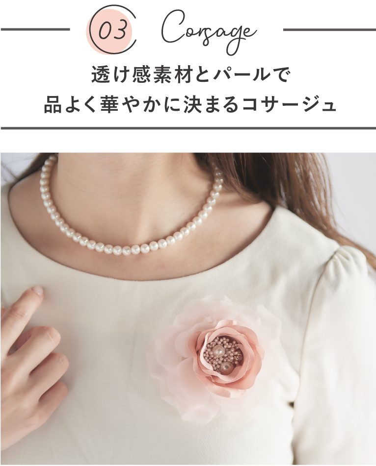 シンプルなフォーマル服のワンポイントにぴったりの上品なコサージュ。