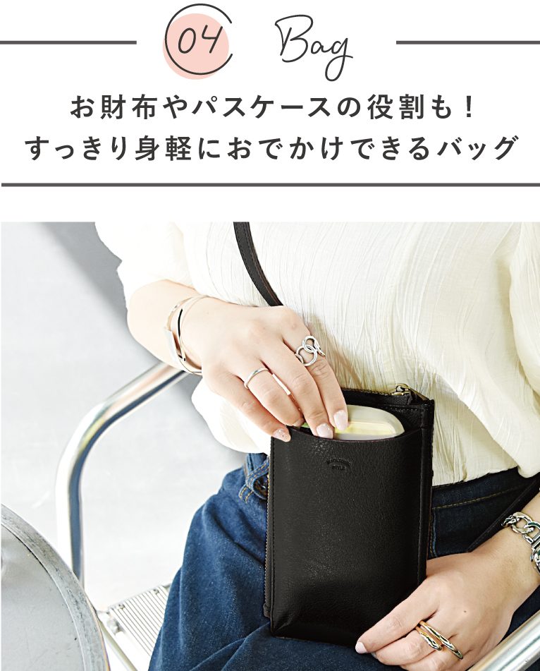 スマホがすっぽり入る大きさのコンパクトなショルダーバッグ。お札入れやコインポケットがある他、カード入れも4つあるので、お財布としてもお使いいただけます。