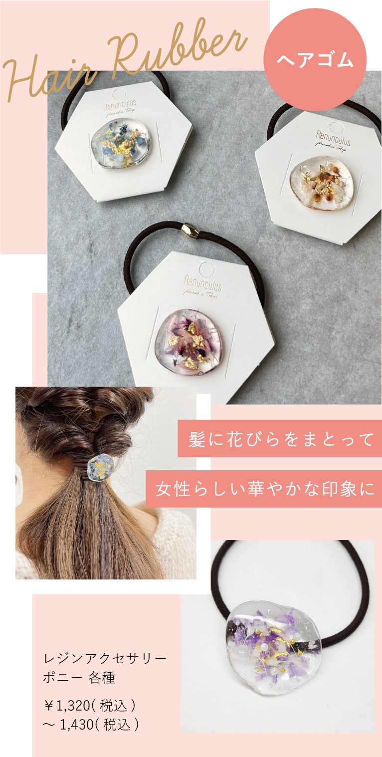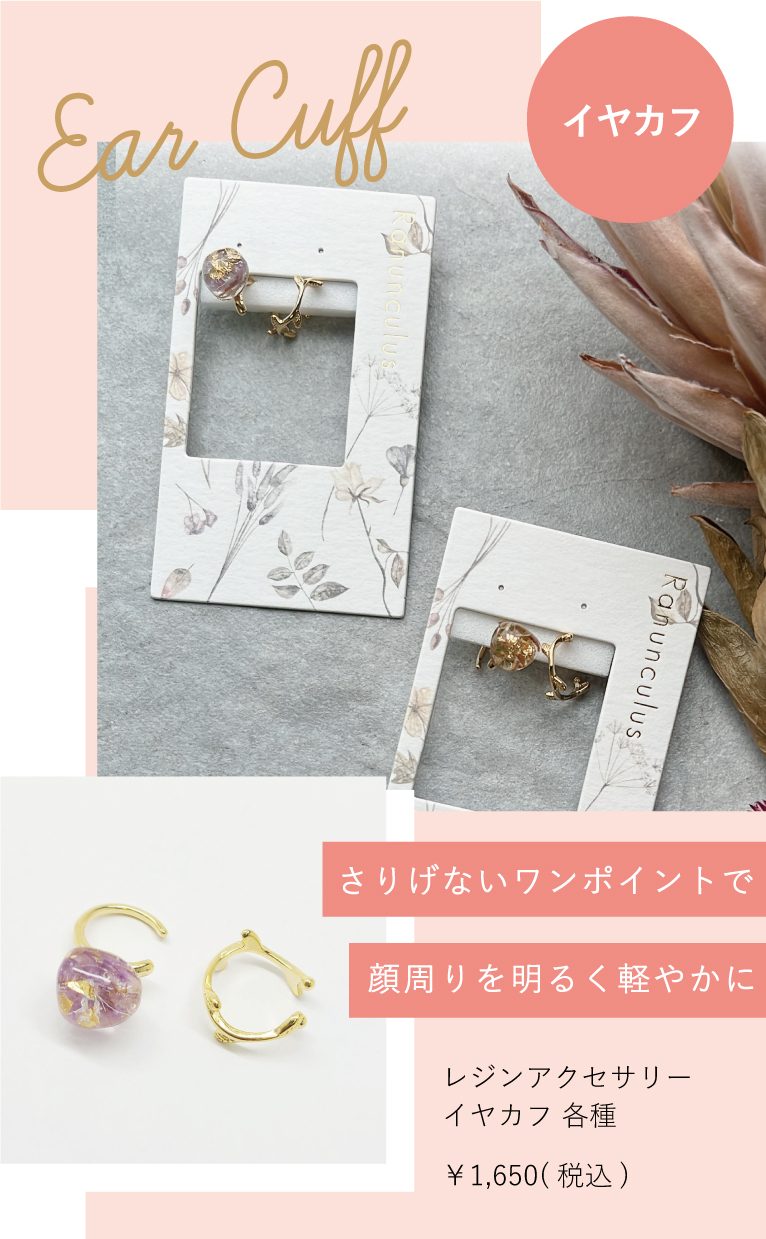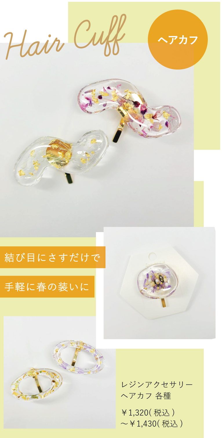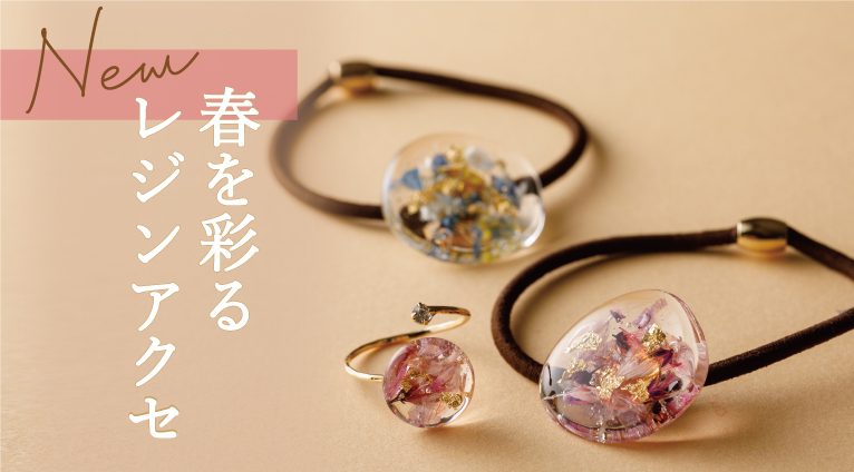 さわやかな透明感が魅力的なレジン。花びらの上品さと金箔の華やかさを兼ね備えた、軽やかで女性らしい新作のレジンアクセサリーが入荷しました!
