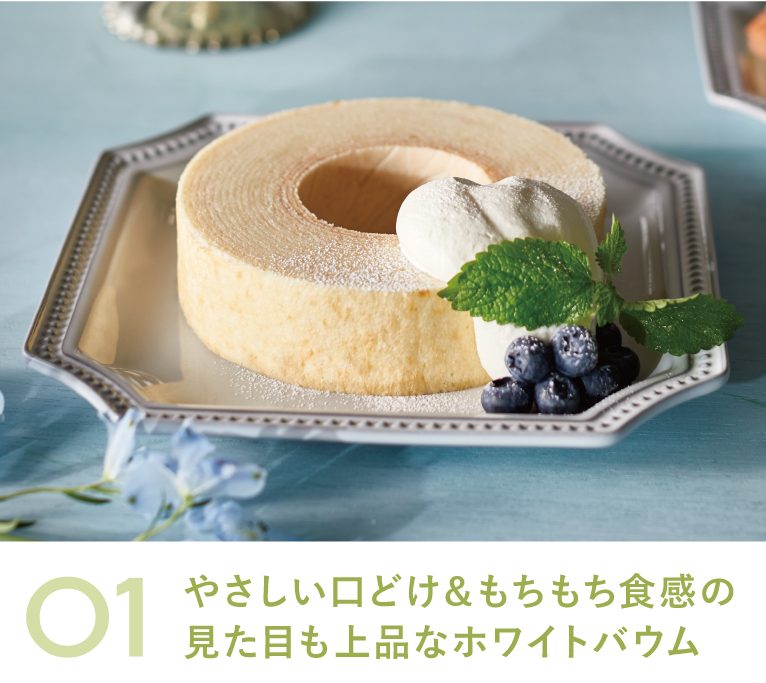 ウェディングドレスをイメージした、白くて上品なバウムクーヘン。クーベルチュールのホワイトチョコを生地に混ぜ合わせて、やさしい口どけに仕上げました。しっとりとしたもちもちな食感は、様々な年代の方に喜んでもらえること間違いなしです。