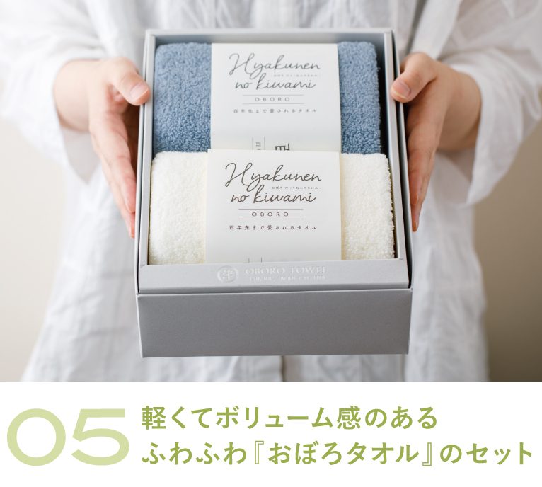ボリューム感がありながら、生まれたての赤ちゃんにも使えるくらいふわふわな『おぼろタオル』。吸水性・速乾性にも優れ、実用性抜群です。シンプルな箱にひとつひとつ丁寧にラベリングされたタオルを詰め合わせた気品あふれるギフトセットで、ワンランク上の贈り物に。