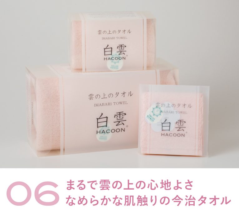 究極の肌触りを追求し、綿花が本来持つ柔らかい肌触りが魅力の「白雲タオル」。吸水性抜群の高品質な今治産タオルです。やさしいカラーとクリアなパッケージがおしゃれで、アミングでも内祝いに大人気のアイテムです。