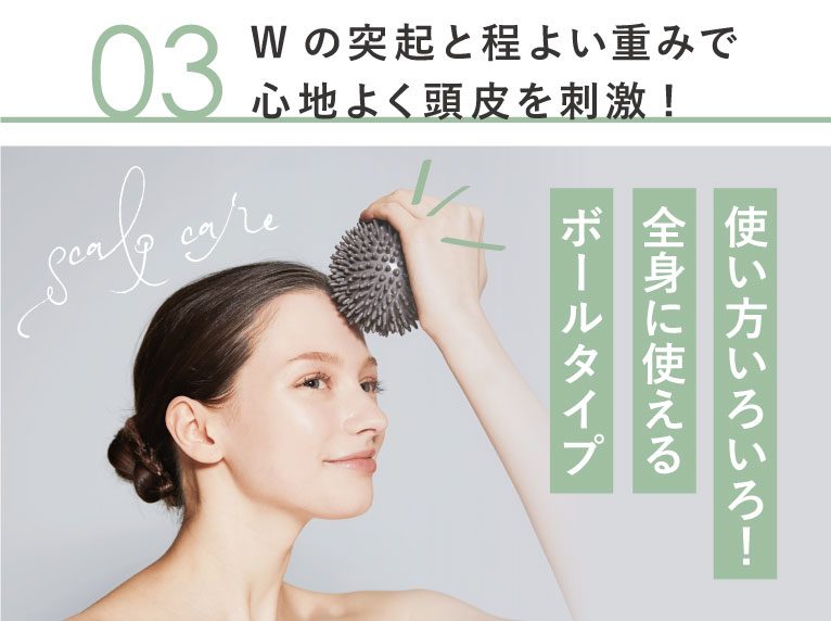 コロコロ動かしたり、そのまま押したり、使い方もいろいろ!あたま、おでこ、口角、フェイスライン、肩、背中、膏肓(こうこう:肩甲骨の内側中央あたりにあるツボ)、足の裏など、頭皮に限らず全身にお使いいただけます。あてて心地いいと感じる箇所のケアにお使いください。