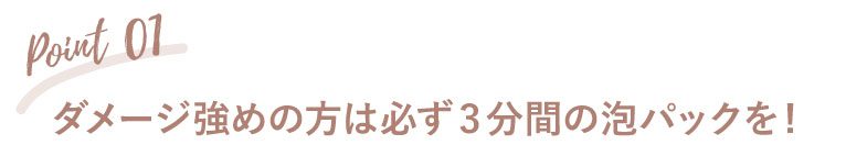 予洗いをしっかり行い、軽く髪の水気をきりましょう。十分泡立てたトリートメントシャンプーをのせたまま3分間待つと、美容成分が髪にしっかり浸透していきます。