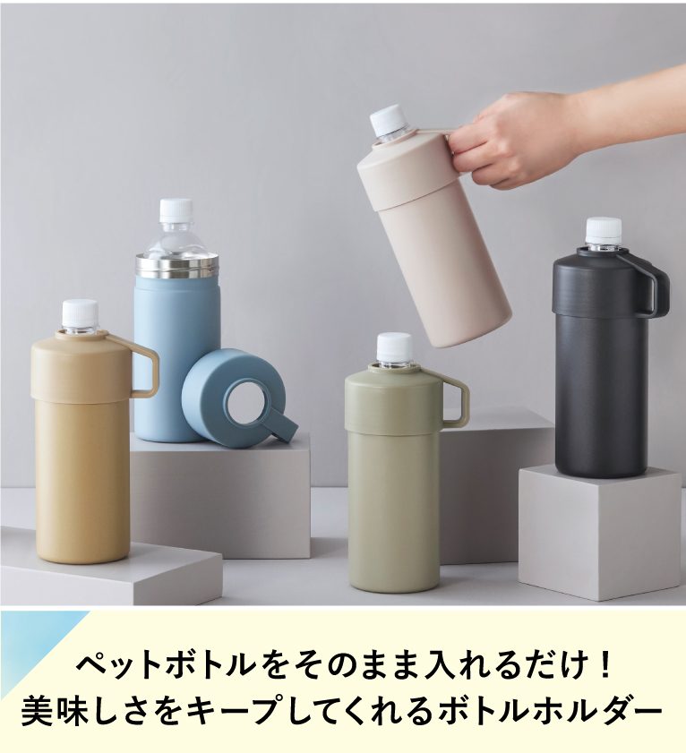 市販のペットボトルをそのままポンと入れるだけ!ステンレス製の真空二重構造で、美味しく飲める温度をしっかりキープ。冷たいペットボトルを入れても結露しないので、かばんの中に入れての持ち運びにも◎