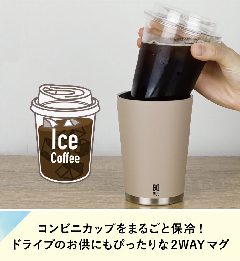 コンビニのコーヒーカップをそのまま保冷&保温してくれるステンレスマグ。コンビニのアイスコーヒーやコーヒーショップのカップなど、広くマッチする大きめサイズになっています。
