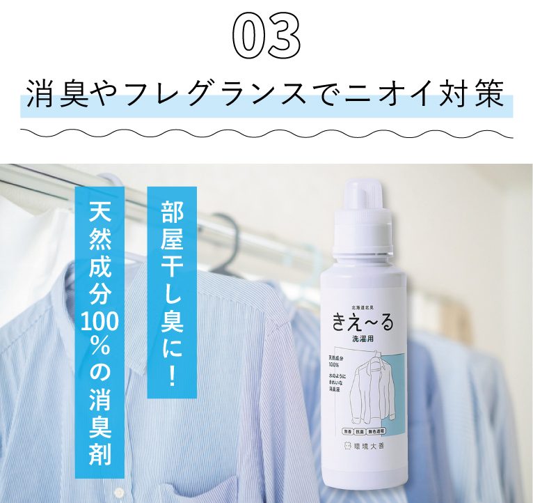 乳酸菌などの環境微生物を発酵・培養した「善玉活性水」から生まれたバイオ消臭液。洗濯する際に入れるだけで、洗剤だけでは取りきれない繊維製品にしみついた臭いを消臭・抗菌。洗濯槽のカビ予防にも◎