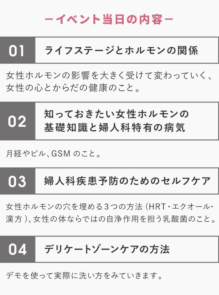 知る機会の少ないデリケートゾーンの正しい洗い方など、診療に携わる産婦人科医から直接お話が聞けるチャンスです。これからの心と体との向き合い方がきっと変わる勉強会は、オンラインでも開催いたしますのでぜひお気軽にご参加ください。