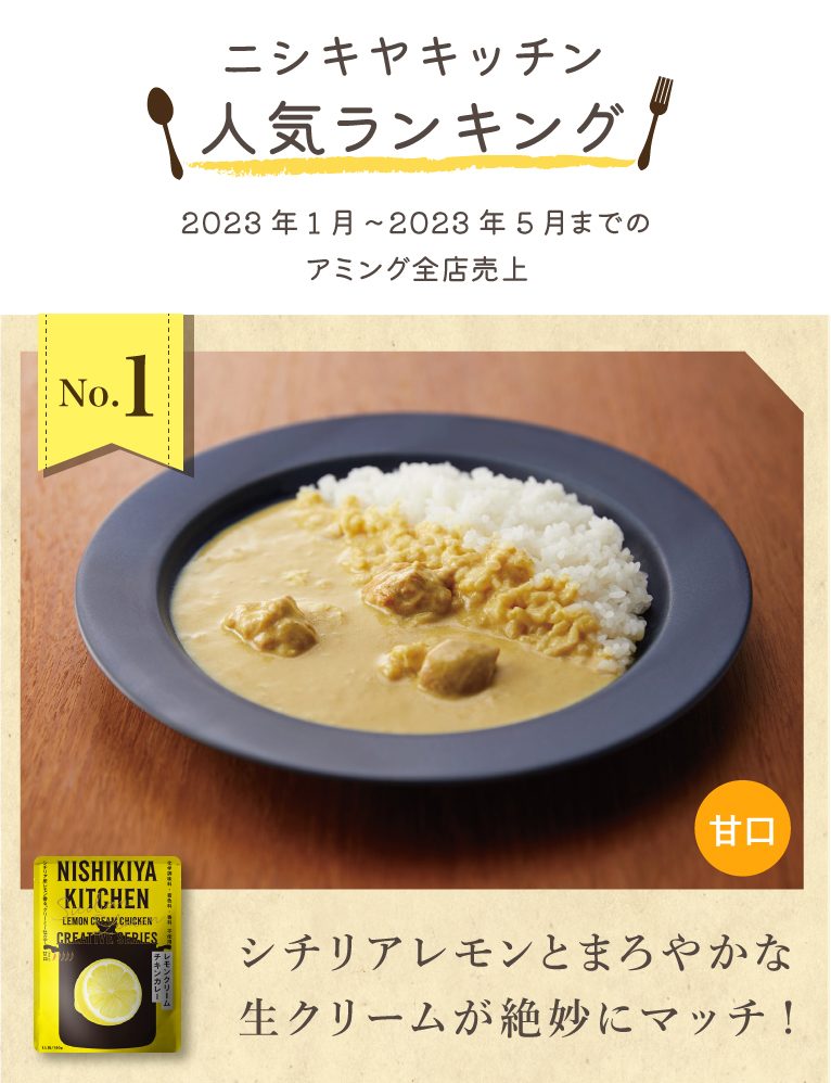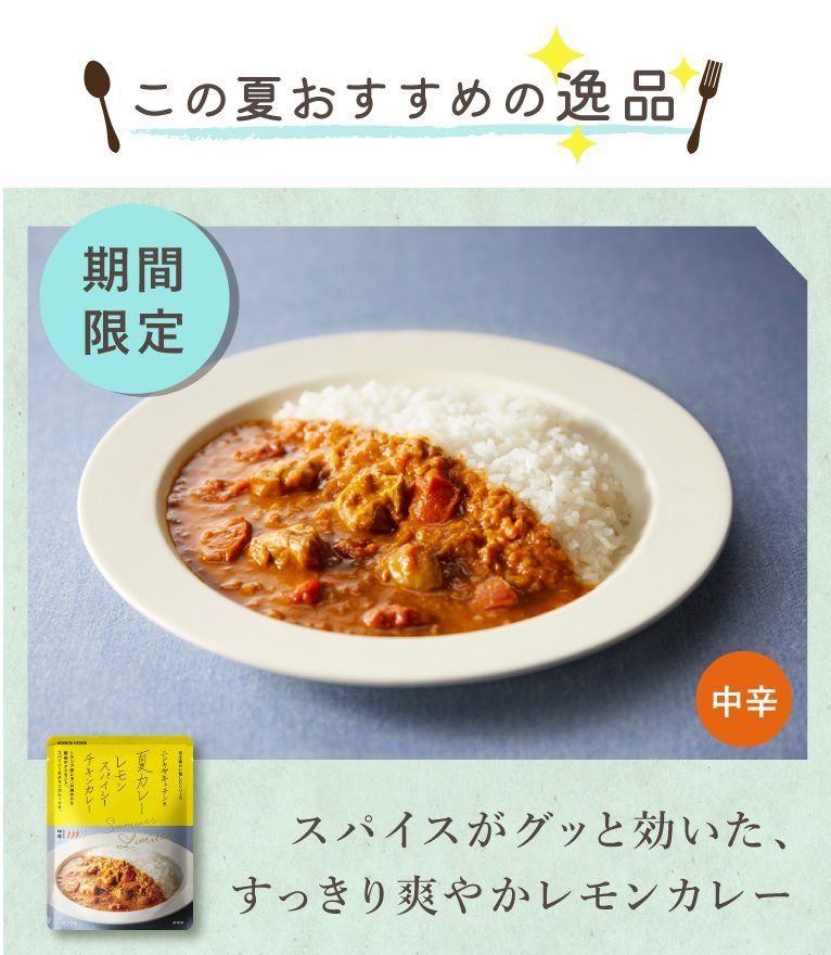 ニシキヤキッチンで一番人気の「レモンクリームチキンカレー」を季節に合わせてアレンジ♪特製のスパイスミックスに加え、赤唐辛子や黒コショウを効かせたチキンカレー。シチリア産レモンの爽やかな酸味とトマトの旨みをプラスした、夏にぴったりのすっきりとした味わいのカレーです。
