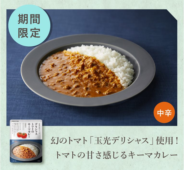宮崎県のデリシャスファームさんの農場で育てられた「デリシャストマト」のバランスの良い甘みと酸味をいかした味わい。濃縮したトマトをベースに鶏ひき肉を合わせ、トマトとひき肉の旨みたっぷりのキーマカレーに仕上げました。