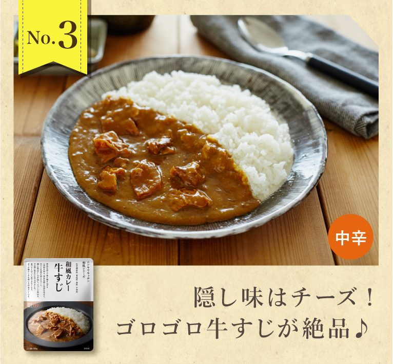牛すじ肉をやわらかく煮込んだ中辛カレー。煮込む前に丁寧に焼き上げる一工夫で、牛すじ肉に旨みと香ばしさを閉じ込めました。カレーには、牛すじ煮込みを思い起こさせるみそとしょうがを加え、隠し味にチーズをプラス。じっくり煮込んで、コクのある味わいに仕上げています。