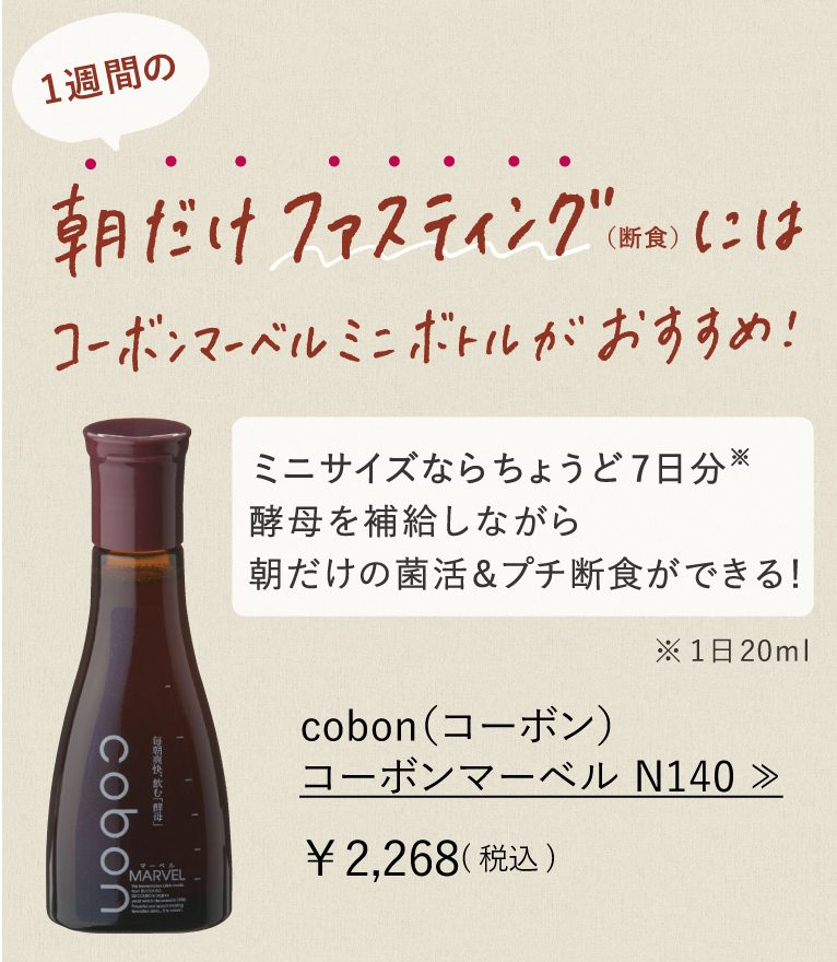 食べすぎた日の翌朝や食欲があまりない朝などに、私が実践しているプチファスティングです。ごはんやパンなど固形の食事を摂る代わりに天然酵母飲料の「コーボンマーベル」を一杯飲むだけ。がんばった胃腸の負担をなるべく少なくする方法として、最近取り入れています。