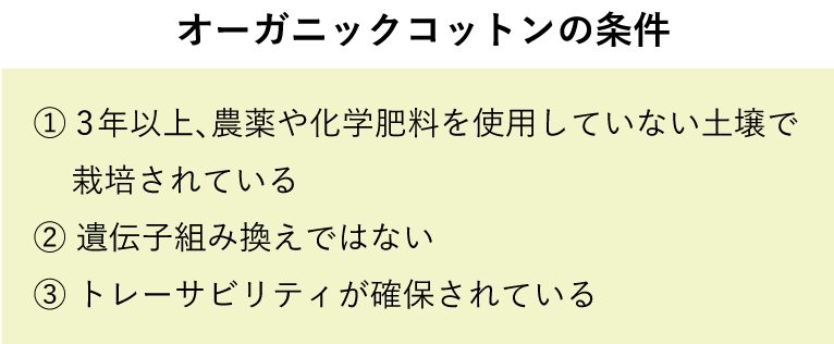オーガニックコットンは直訳すると「有機栽培された綿」のことです。国際的に、一定の条件をクリアしたものがオーガニックコットンと呼ばれます。その主な条件は3つ。