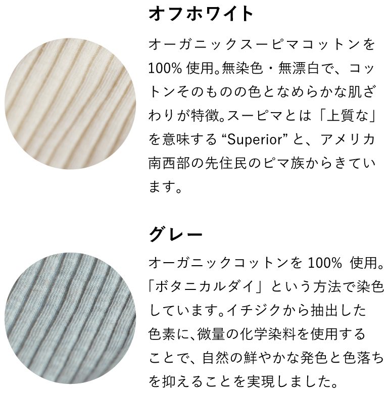 オフホワイトは、オーガニックコットンの生産量の内、1%に満たない非常に希少な素材の「オーガニックスーピマコットン」を使用。長年愛用されている方は、無染色でスーピマコットンを使用したオフホワイトを選ぶ方が多いそうです。私もそれを聞いてからオフホワイト派になりました。