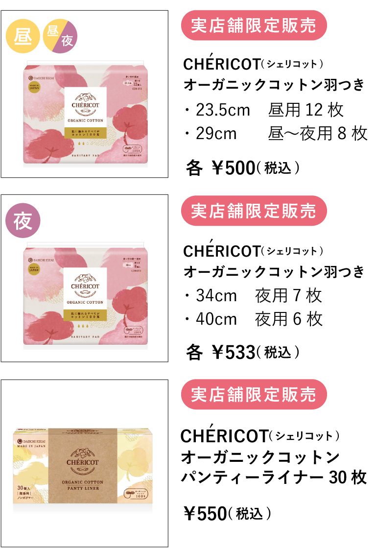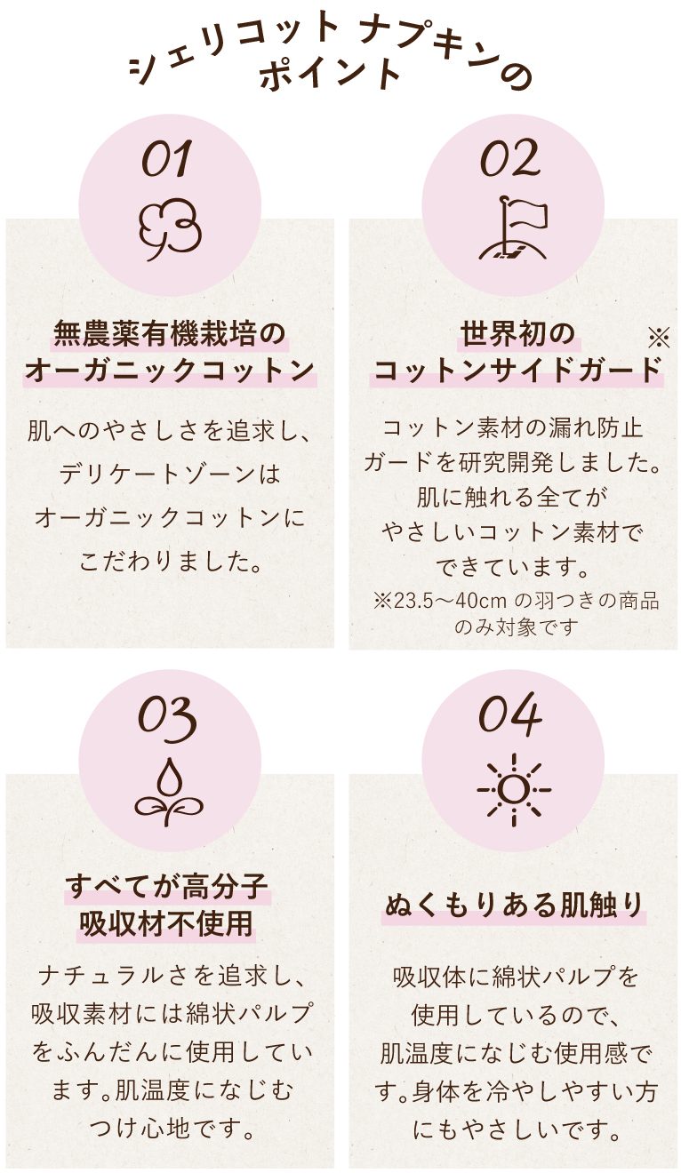 さらに、コットン100%のサイドガードは世界初。メーカー独自の高い技術により、化学繊維を使わず伝い漏れを防ぐことができ、オーガニックコットンナプキンの心地良さをさらに高めてくれています。