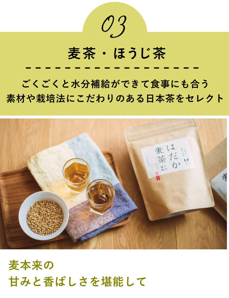 暑い夏のドリンクといえば、やっぱり麦茶。ミネラル豊富で、ノンカフェイン。無農薬・無化学肥料で育てられた、こだわりの「はだか麦」を使用し、体にやさしく家族みんなでお飲みいただけます。