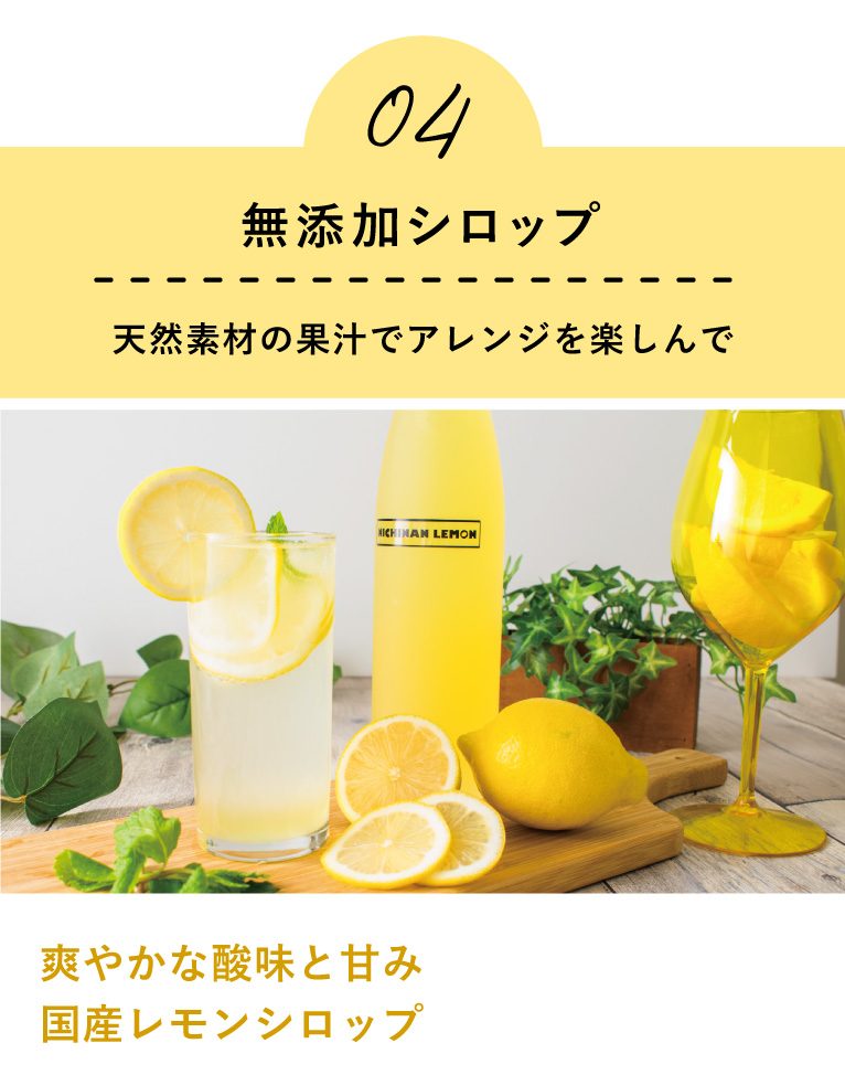 原材料全て日本産の宮崎県日南産のレモンとてんさい糖で作ったこだわりの無添加シロップ。太陽をたっぷり浴びたレモンのすっきりとした酸味と甘味が暑い夏にぴったり。