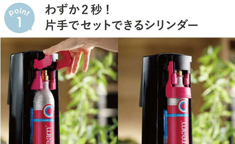 ソーダストリーム史上初となる「シリンダークイックコネクト」を採用し、従来のねじ込み式ガスシリンダーより取り付けが簡単に!ワンタッチでボトルの着脱ができるので、女性やお子様でも取り替えらくらくです♪