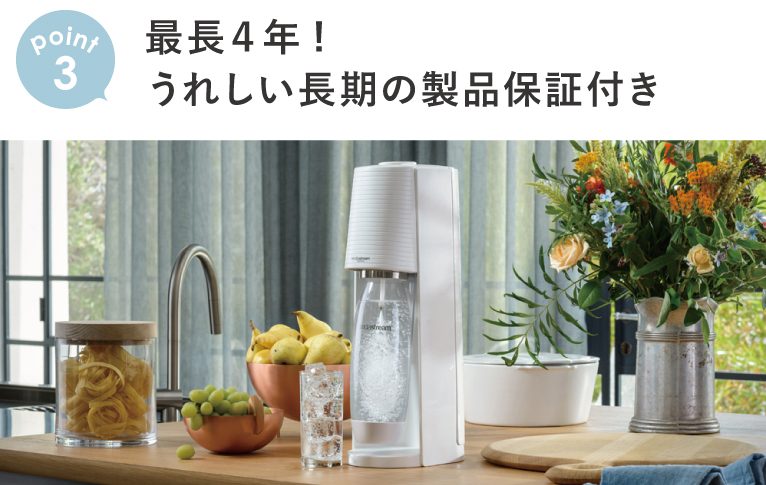 「テラ」を購入し、ソーダストリームブランドサイトに「会員登録」をした方は、通常2年の保証期間をさらに2年延長!最長4年の製品保証に!