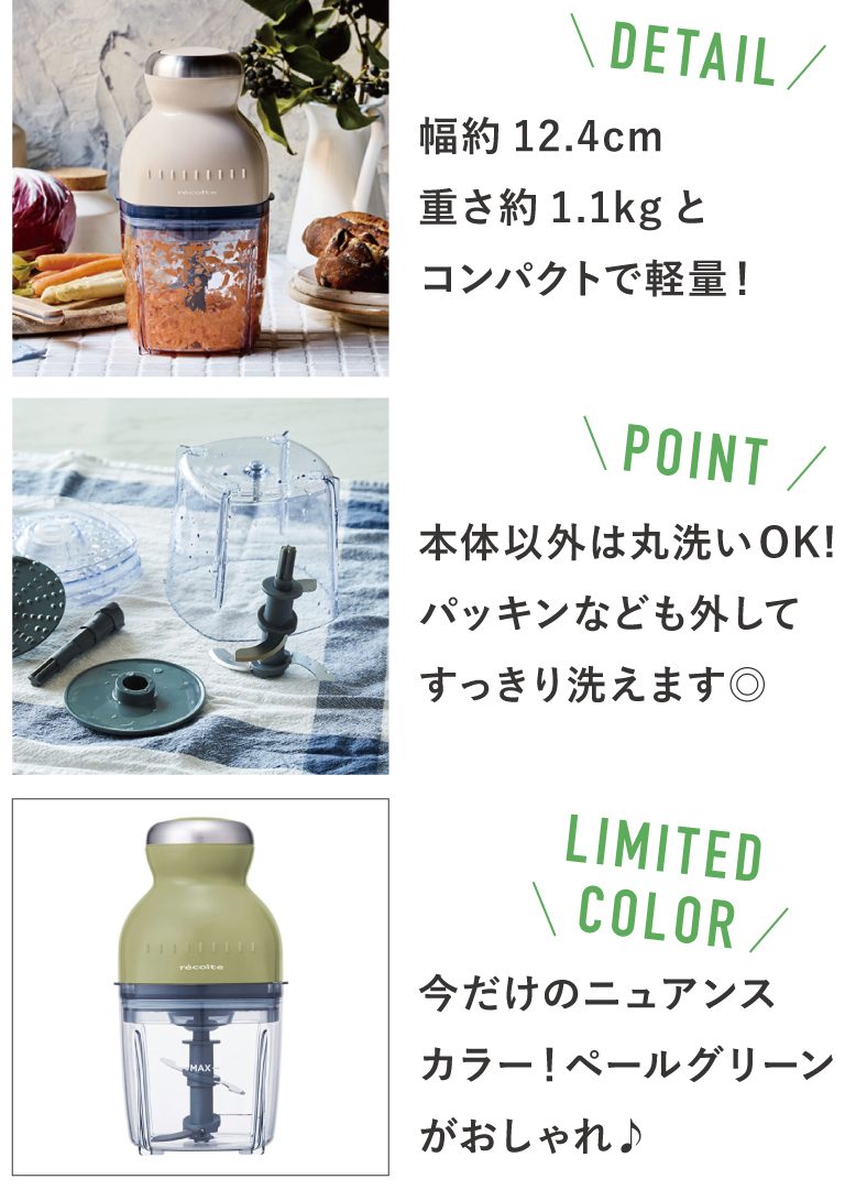 刃を回転させる回数で、仕上がりは粗みじんから細みじんまでお好みで調整可能です!水洗い出来るのでお手入れもカンタン♪